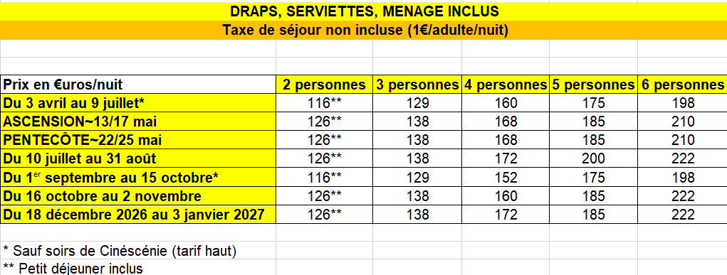 Le coût de la nuit par personne est de 33€ à 63€ selon les périodes.